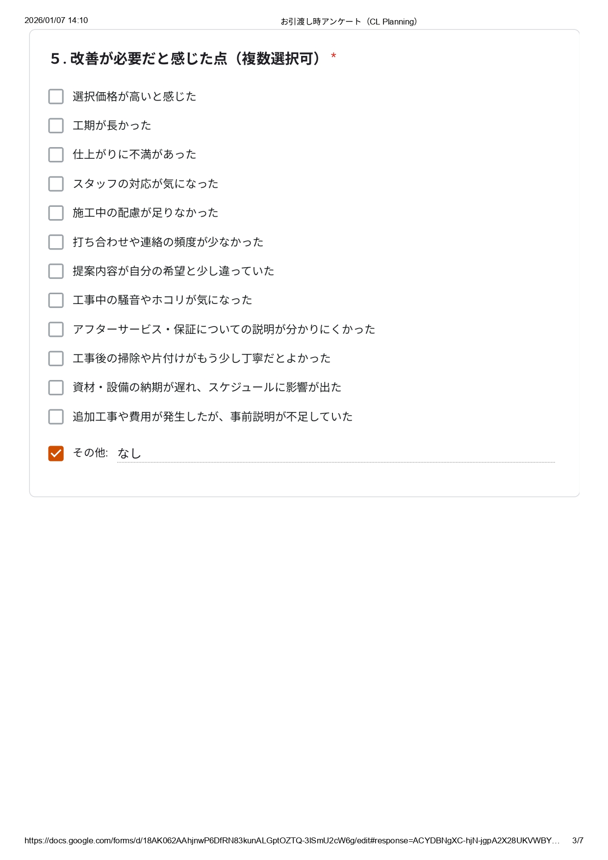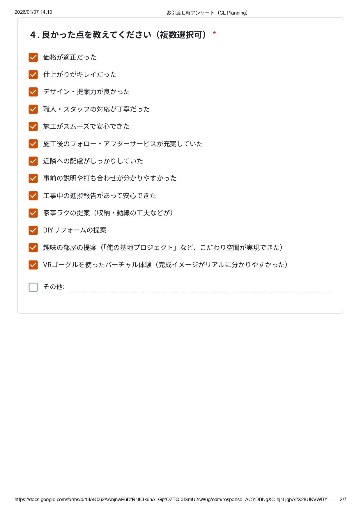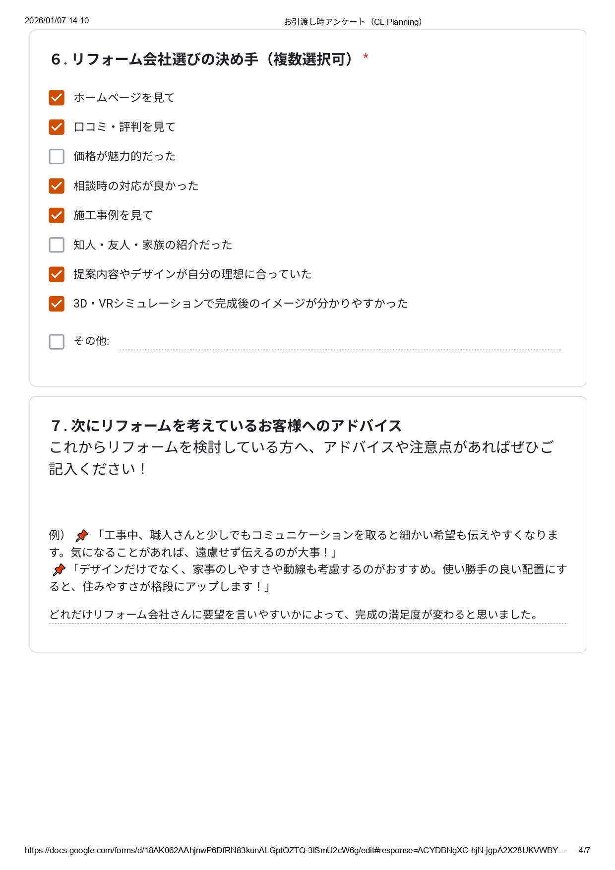 他社とも比較されたうえで、私たちにご依頼いただいた理由や弊社でリフォームして実際どうだったかなど、施工後にお客さまアンケートにて伺いました。