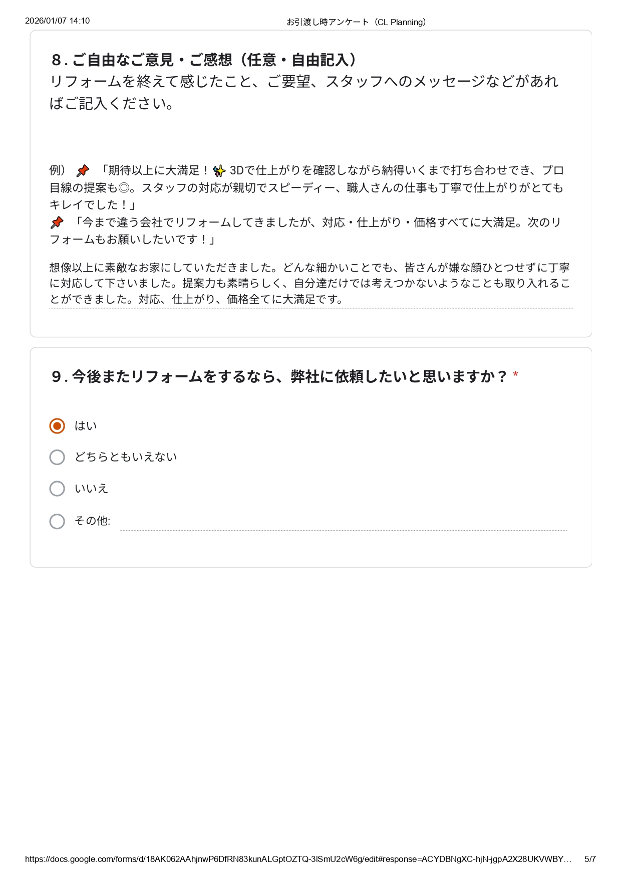 | 今後またリフォームをするなら 弊社に依頼したいと思いますか? | はい |